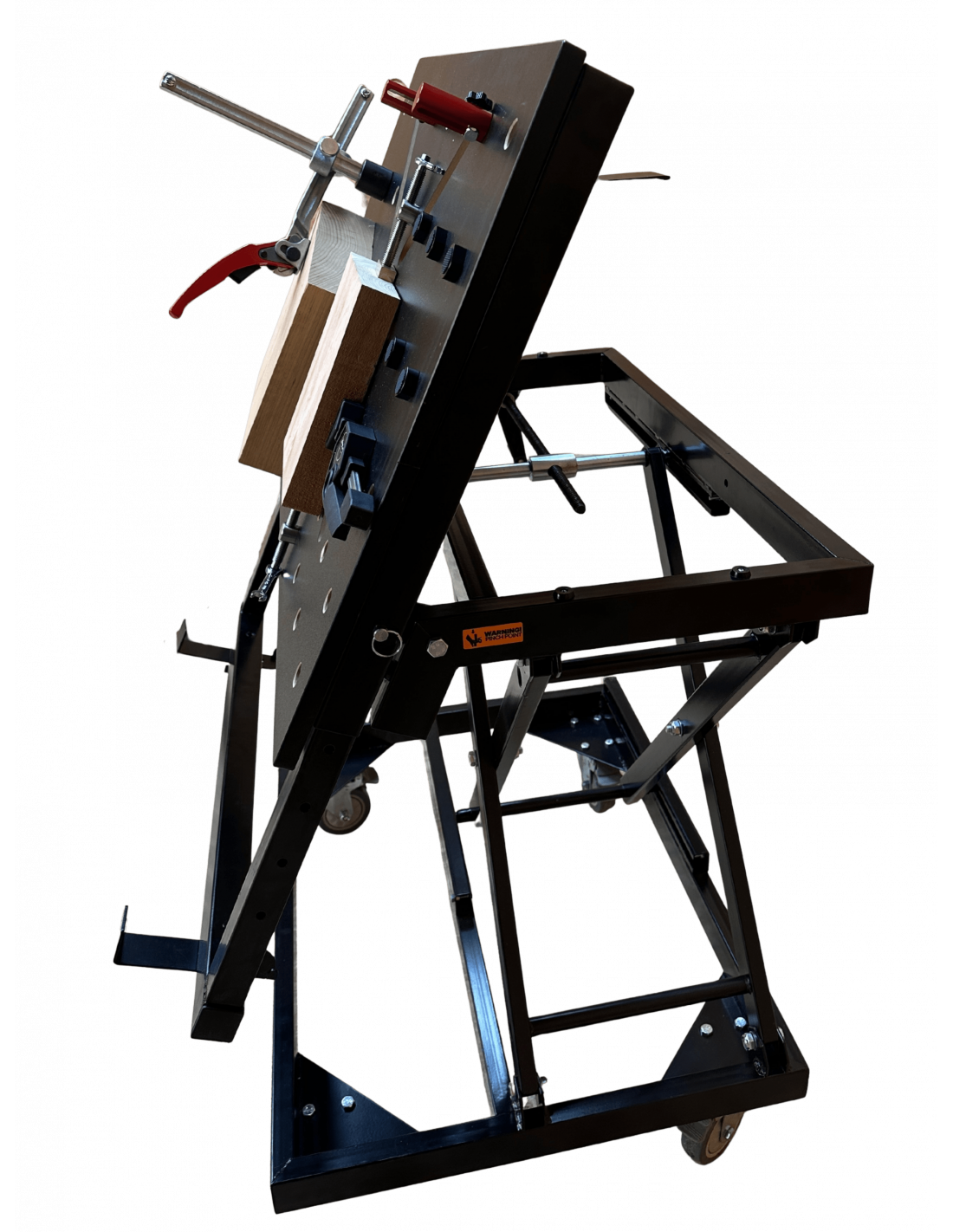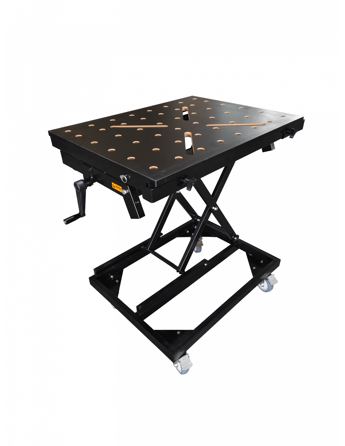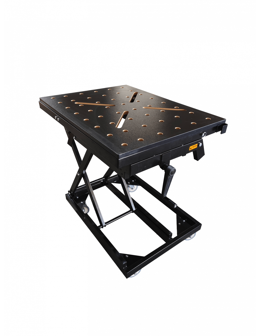 La table élévatrice TE070 est idéale pour positionner et travailler vos pièces en toute sécurité. Son cadre supérieur de 800 x 595 mm s’étend jusqu’à 1000 mm et pivote à 75° pour un confort d’utilisation optimal. Le plateau en MDF de 18 mm intègre 25 trous Ø20 mm et 4 trous oblongs pour un bridage efficace. Sa hauteur se règle facilement de 465 à 965 mm via un mécanisme à ciseaux manivelle. Sa conception robuste supporte jusqu’à 70 kg.