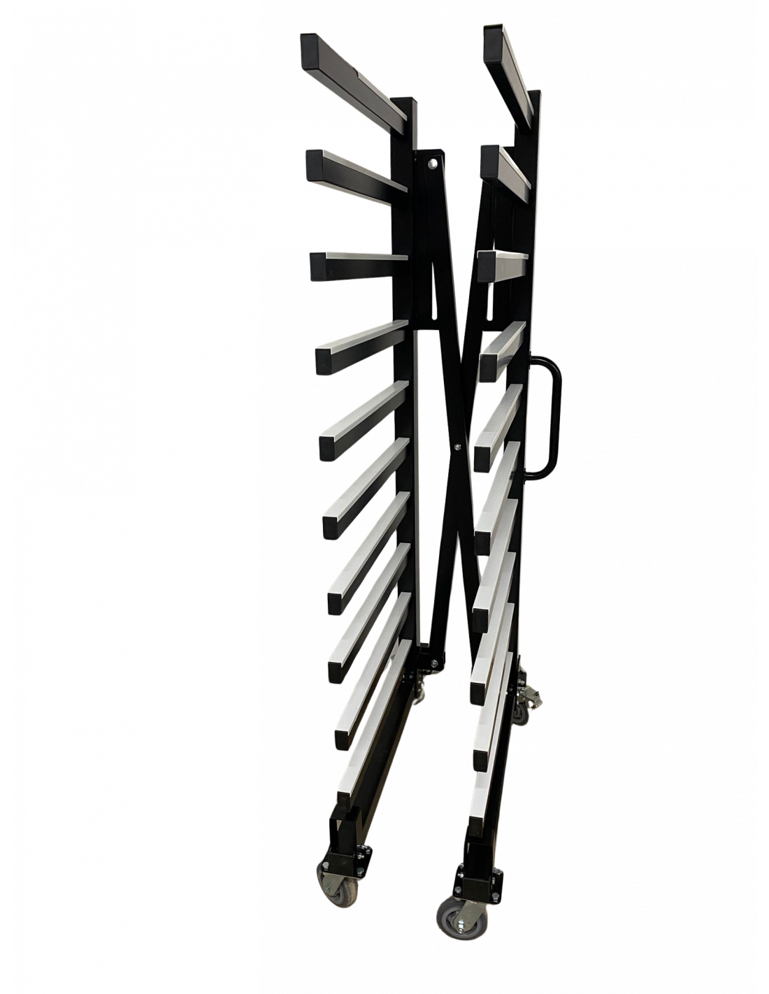 Équipé de 10 étagères espacées de 120 mm, chacune recouverte de lattes en PVC, ce chariot protège efficacement les surfaces traitées (peinture, vernis, laque, finition) contre les chocs et les marques. Il offre une capacité totale de 500 kg, avec une charge maximale de 50 kg par étagère, assurant un stockage fiable et sécurisé.