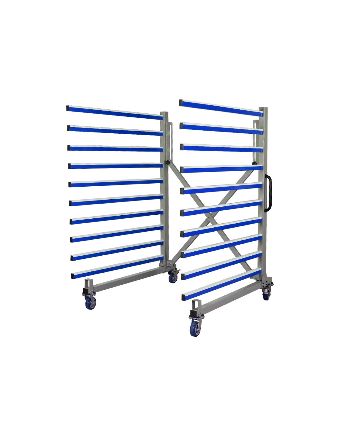 Sa structure en acier tubulaire robuste garantit une excellente stabilité et une grande durabilité, même en usage intensif. Le chariot est extensible de 300 à 1250 mm, permettant d’adapter facilement la largeur de stockage en fonction de la taille des panneaux et des besoins de production.