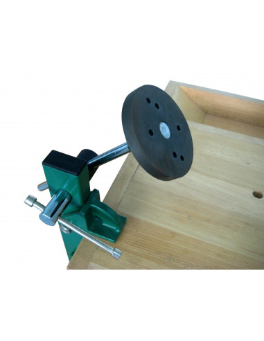 Cet étau se fixe sur tous les établis ou plans de travail d’épaisseur maximale 95mm. Grâce aux vis, la pièce à sculpter se fixe sur le plateau puis l’ensemble doit glisser dans l’étau. La pièce pourra ainsi tourner à 360° mais aussi être régler en hauteur et s’incliner. Pour des travaux de dégrossissage qui nécessite une grande pression, le plateau rond peut être immobilisé par des goupilles.