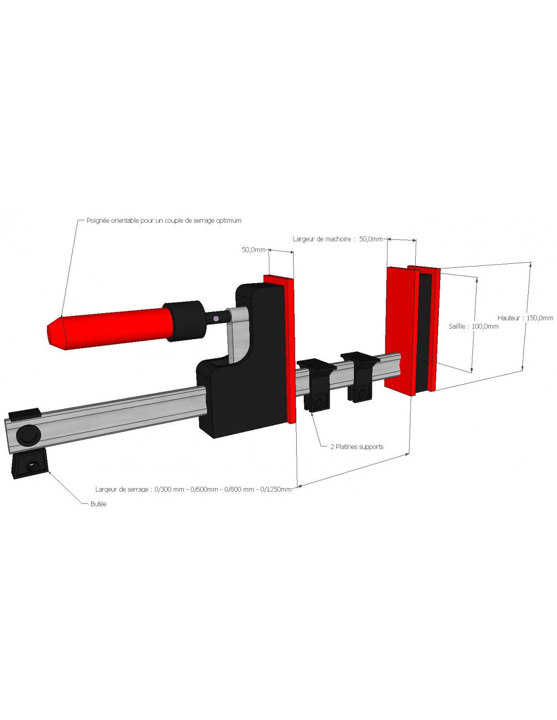 Deux supports de maintien empêchent les pièces de toucher le rail, et la butée amovible permet de passer aisément en fonction écartement selon vos besoins.