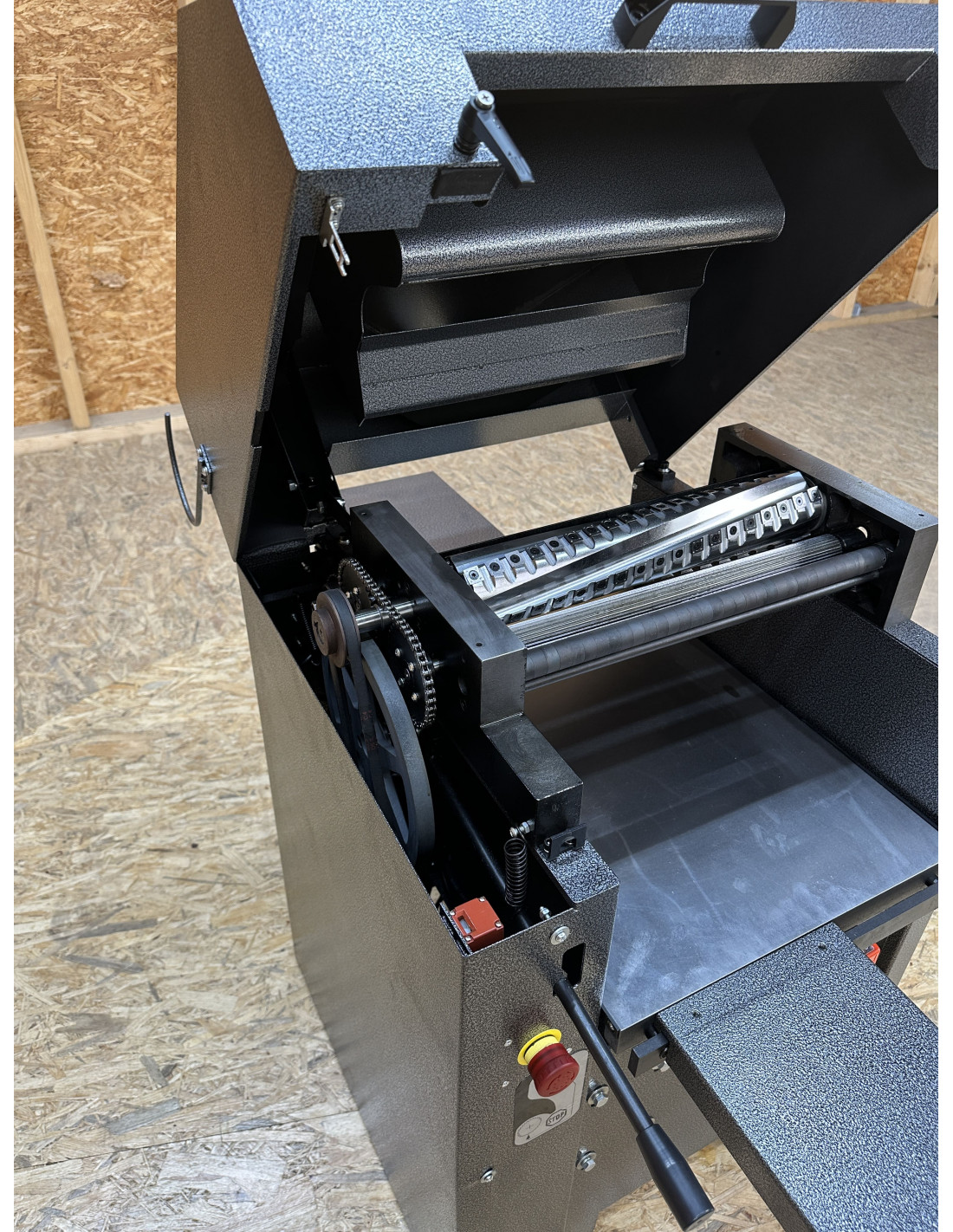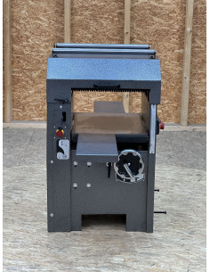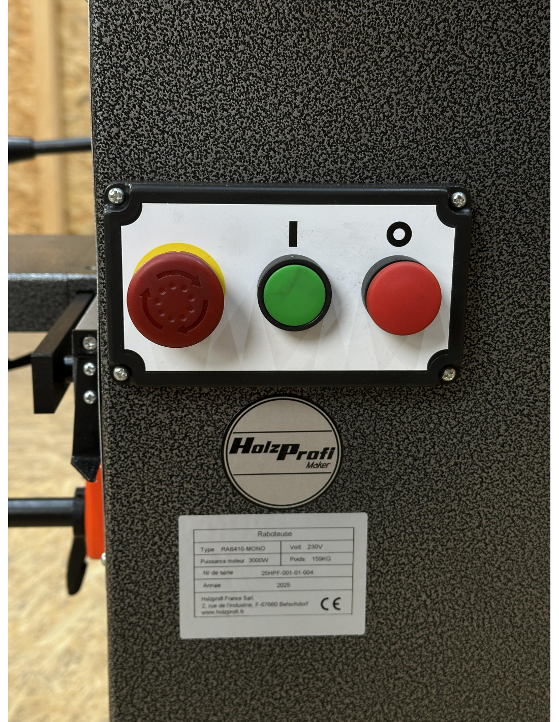 Raboteuse Holzprofi Maker 410 mm avec arbre hélicoïdal à 72 plaquettes carbure, largeur 410 mm et hauteur 230 mm. Table en fonte avec rallonges, vitesse d’avance 5,4 m/min, prise de copeaux 4,5 mm. Idéale pour une finition impeccable sur tous types de bois.