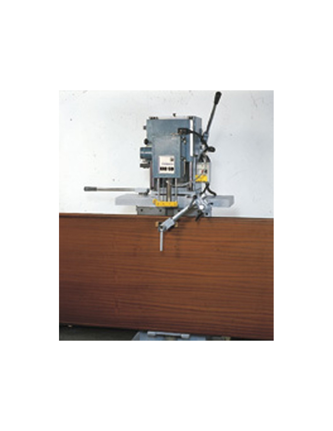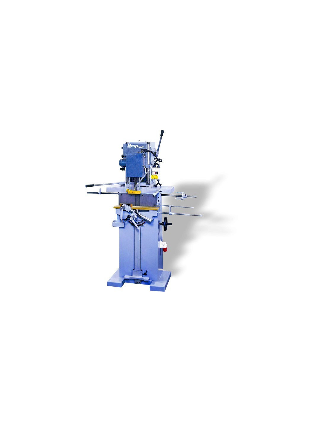 Cette mortaiseuse est équipée en série d'une pompe de lubrification et d'un presseur frontal mécanique pour garantir un travail de qualité. Son bâti robuste en fonte, sa tête et son chariot assurent une grande durabilité. La table de travail est inclinable et la tête se tourne facilement. Livrée sans chaîne ni guide.