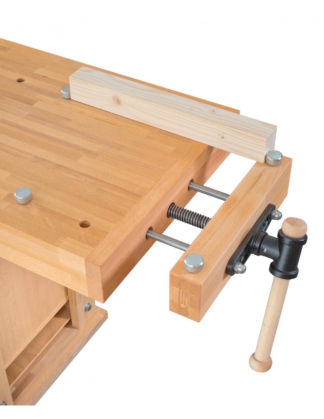 Cet établi d'atelier en hêtre lamellé possède des plateaux épais et élargis par une alaise assurant leur rigidité. Ces derniers dispose de trous facilitant ainsi le serrage de pièces de différentes formes au moyen de butées (4 au total). Livré démonté.