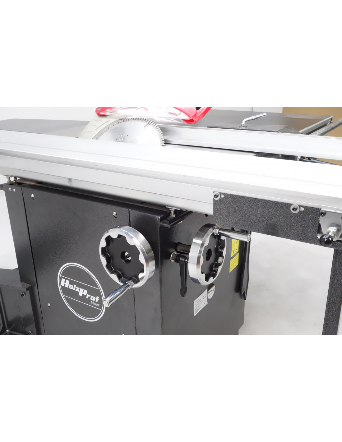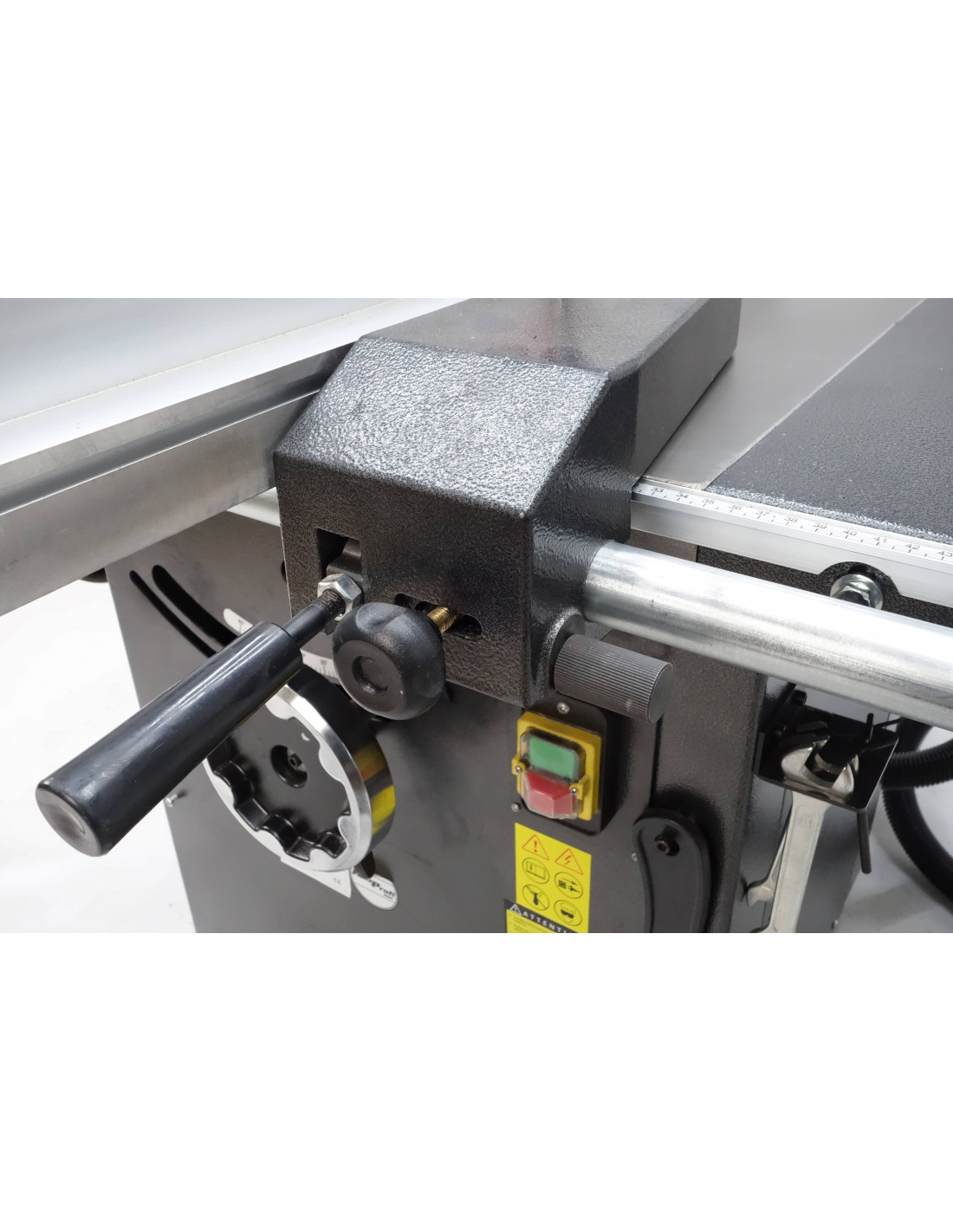 La scie à format SAF1600M-MONO Holzprofi maker est conçue pour les ateliers compacts. Avec un chariot aluminium de 1600 mm et une capacité de coupe de 1540 x 940 mm, elle assure des performances élevées dans un espace réduit. La table en fonte (795 x 350 mm) est équipée de rallonges pour une surface de travail étendue. Compatible avec une lame Ø315 mm, cette scie monophasée combine efficacité et compacité, idéale pour les menuisiers exigeants.
