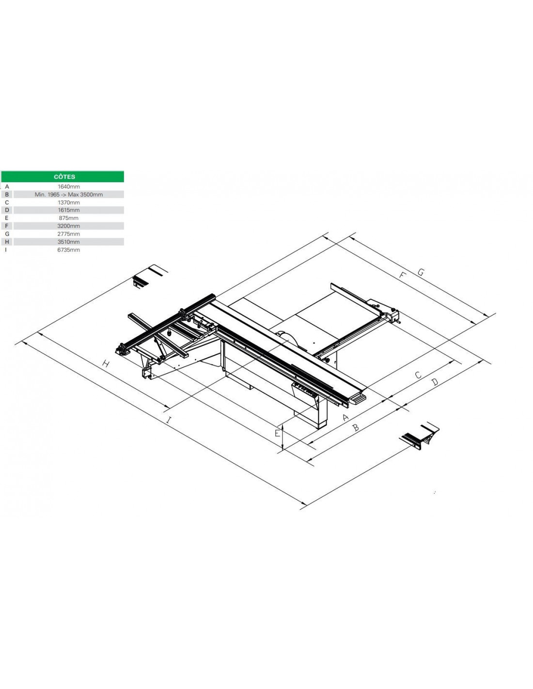 Le chariot de délignage en aluminium, mesurant 3200 mm de longueur et 395 mm de largeur, assure une précision optimale pour des coupes allant jusqu'à 3200 mm. Le cadre du chariot, de dimensions 660 x 1300 mm, est équipé d'un rouleau pour une manipulation aisée. Cette scie permet une largeur de coupe après la lame de 1300 mm et offre une hauteur de travail confortable de 880 mm. Compatible avec une lame de 400 mm de diamètre et un arbre de 30 mm, elle offre une hauteur de coupe maximale de 135 mm. La lame est inclinable de 0 à 45°, offrant une grande polyvalence pour divers types de découpe