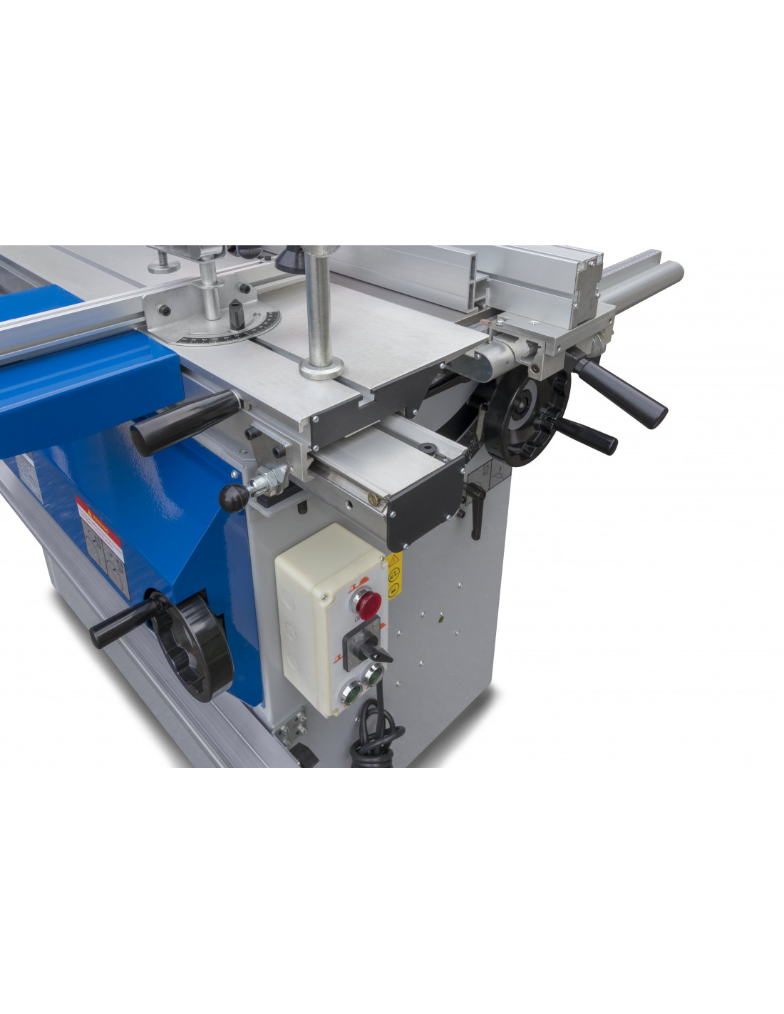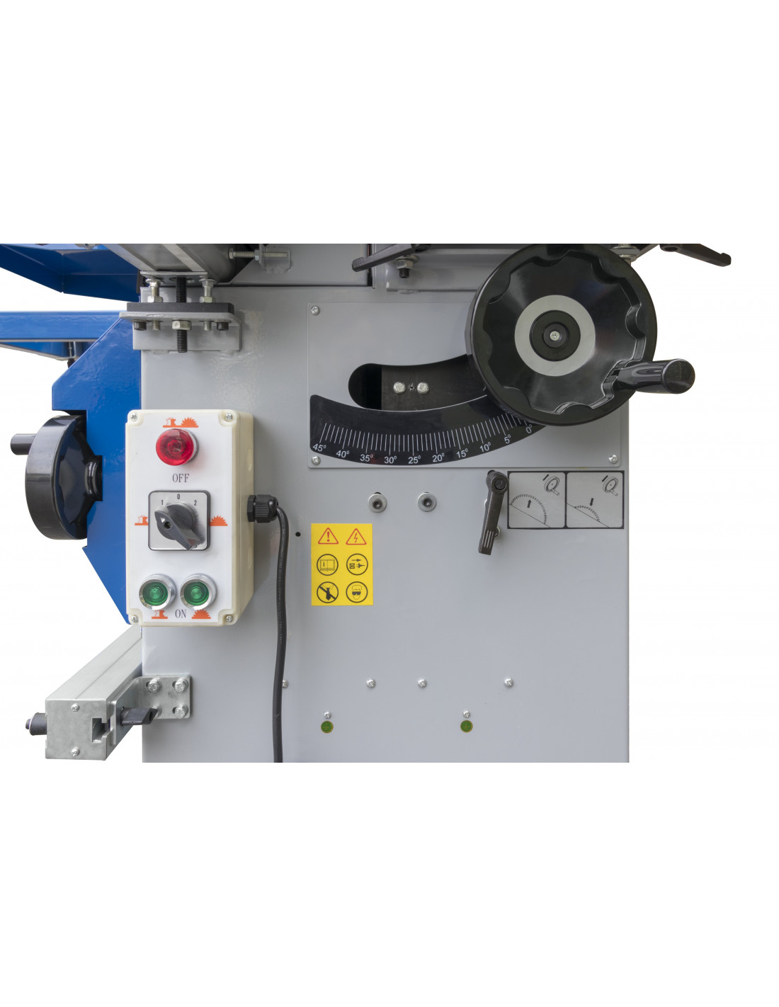 Découvrez la toupie-scie TS1200I, un outil polyvalent et performant conçu pour les ateliers de menuiserie exigeants. Cette machine monophasée combine une scie et une toupie, toutes deux dotées de fonctionnalités avancées pour répondre à tous vos besoins. La scie, avec sa table en fonte robuste de 1200x840 mm, est équipée d'un chariot en aluminium coulissant au ras de la lame, offrant une longueur de coupe de 1400 mm pour une précision maximale. Avec une lame de Ø 250 mm et un inciseur de Ø 88 mm, inclinables de 0 à 45°, elle atteint une hauteur de coupe de 65 mm à 90° et 45 mm à 45°. La scie fonctionne à une vitesse de 4050 t/min pour la lame principale et 6300 t/min pour l'inciseur, propulsée par un moteur frein de 2,2 kW/3 CV monophasé, garantissant sécurité et performance.